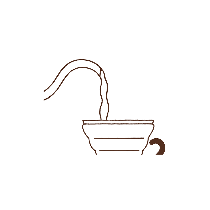 Begin pouring a steady, even stream of hot water over the grounds in a circular motion. Aim for the center of the cone, avoid pouring water directly onto the filter. Keep the water level within the cone at about two-thirds full. Continue slowly pouring at the center until your scale displays ‘320 grams.’